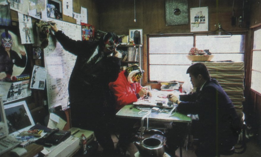 私は旗揚げ前日に改めて盛岡入りする。東日本ホテルには新幹線で来たグラン浜田、ブラックマン、エル・シグノ、ケンドー、エル・サグラド、ロッキー・サンタナらがチェックイン。旗揚げ前日の記者会見では、あるあるの金屏風前での乱闘(サスケvsデルフィン)がやっぱりあった。その後、トレーニング場でスパーリングをした後に合宿へ行く。そこにはデルフィン、SATO(ディック東郷)、獅龍、テリー・ボーイ(Mensテイオー)、バッファロー張飛、モンゴリアン勇牙(新崎人生)、木村吉公(愚乱・浪花)が集まっていて、夜の最終ミーティングが始まるが、後楽園とかで見る彼らの顔付きと違って、ものすごく緊張感が走っているのがわかった。この時点で彼らはまだユニバーサルの選手だった(デルフィンはユニバ大阪支部のワキタ・プロダクション)。サスケ専務が「清水さんも何かあったら、一言いただけますか」と突然振るもので、私はそこで生意気にも若い彼らの前で演説をぶってしまったのだ。中身は忘れたが、プロとしての心構えを説くようなことだったと思う。そうしたら緊張していた彼らがもっと緊張してしまったのを憶えている。でも、私はこう思っていた。彼らよりも、トリ(メイン)さえしっかりしていれば大丈夫だと。メインはサスケ&浜田vsシグノ&ルード(エル・ブロンコ)。ここは鉄板だから心配はしていなかったのだ。