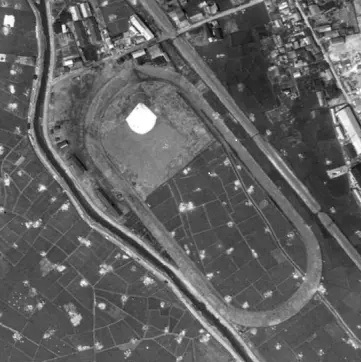 さて、この「諏訪市営球場」とは一体どこにあったのだろうか。今回の調査で所在地を発見した。なんと、球場は上諏訪競馬場の内馬場にあったのだ。1948年撮影の航空写真に競馬のオーバルコースの中、それも西寄りの位置にはっきり野球場がすっぽり入っているのが確認できる。内ラチでも外せば1万人入るスペースは十分にあろう。競馬場同様、国の補助で造られたので、「国立球場」とも呼ばれていたようである(現在も旧・国立球場として市のホームページにその名前が残る)。内野にあったスタンドこそ壊されてしまったが、野球場として現存する清水町球場は、以前の市営球場とほぼ同じ位置だが、空撮写真と照らし合わせるとホームベースのポイントなどが微妙に違う気がする。現在の清水町球場は競馬場の1~2コーナーの中間地点付近に重なる。吉澤さんからここでプロレスをやったという話を聞いたことがない。1949年5月生まれの吉澤さんは、この時9歳。諏訪湖西岸の岡谷市に住んでいたので知らなくても仕方ないかも…。“諏訪の先生”が知らない諏訪のプロレス史を発見してしまったよ(教えてあげたーい!)。