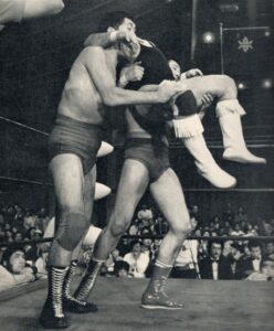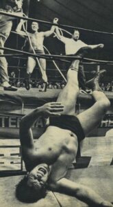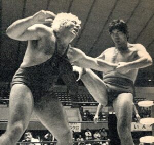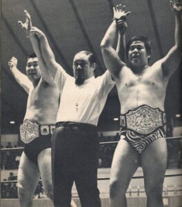 それから4ヵ月後の6月13日、国際は県営初のタイトルマッチをやっている。草津&井上vsキラー・トーア・カマタ&デューク・サベージのIWA世界タッグ王座決定戦である。先週、この試合は盛岡市体育館と書いたが、改めて写真を見ると、これも明らかに県営体育館だ。それなのに当時の記録では盛岡市体育館になっているじゃないか。前述のワールド・シリーズの時と同様、こういう間違いってよくある。「市」と「県」とか…同じ地方都市に大きな体育館が2つあると、地元民はわかっていても、東京から行くマスコミはこういう間違いをよくやらかす。全日本も同じ1975年の10月23日に県営で初興行を打つ。全日本は翌1976年9月30日、ここで馬場&鶴田vsアブドーラ・ザ・ブッチャー&ワルドー・フォン・エリックのインター・タッグ選手権を決行。さらに1977年10月24日には馬場vsケン・パテラのPWFヘビー級選手権をやっている。