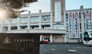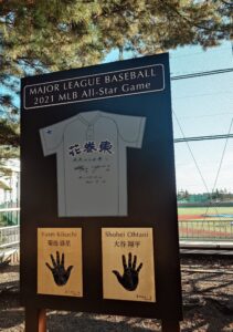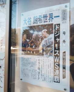 それが「花巻東高等学校」です! ちょうどワールドシリーズをドジャースが劇的に連覇したばかりだから、とってもタイムリー。第6戦は盛岡へ行く車内で、第7戦は盛岡のホテルのテレビで、しっかり優勝を見届けてから県営体育館へ行っている(ぬかりなし!)。学校の前には大きな無料駐車場もあって、校門前でしっかり記念撮影(夕方だったけど観光客もチラホラいました)。選手の出身校へ来たのはジャンボ鶴田の山梨県立日川高校以来だろうか。いやいや、その後に馬場さんの三条実業高校(現・三条商業高校)に行ったっけ……。それはそうと、花巻東は素晴らしい環境だった。校門横から野球のグラウンドへ向かう広い松林の散策路が特に良かった。ここを菊池雄星や大谷翔平が走ったのだろうか。練習グラウンドもかなり本格的。バックネット裏には両メジャーリーガーの手形と、同時2桁勝利達成(2023)の記念モニュメントがあった。さらに大谷のMVP記念や佐々木麟太郎の高校生最多本塁打記録のモニュメントを、ちょうど設置している最中だった。数年でここはボードだらけになってしまうのではないかなあ。馬場さんもジャンボも、お墓だけでなく、母校にこういう記念モニュメントのようなものがあったらいいなとも思った(NWAとAWA奪取のメジャーリーガー?として……)。