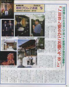 豊登さんが急性心筋梗塞で亡くなったのは1998年7月1日。享年67歳。同年9月27日、竹内さんと新間寿氏がこのお寺を訪れている。それは週刊ゴング10月22日号(736号)の竹内さんの連載『昭和プロレス浪漫』で記事になった。福岡空港からお寺まで車で案内したのは、元新日本プロレス営業部次長で、博多在住の吉田稔氏だった。新間さんにとっては1954年の人形町の力道山道場以来の長い付き合いだ。