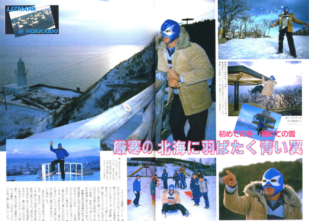 最初に厳冬のオホーツクを見たのは全日本であった。1984年『新春ジャイアントシリーズ』第10戦の紋別市スポーツセンター。この時は室蘭から北海道に入り、翌日が北見、そしてオホーツクに面する紋別に入って来たのだ。メインはジャイアント馬場&天龍源一郎&ザ・グレート・カブキvs上田馬之助&鶴見五郎&ケリー・キニスキー。セミがテリー・ゴディ&マイケル・ヘイズvsジャンボ鶴田&阿修羅・原。そしてリスマルクvsマッハ隼人もあった。写真上のゴングのグラビアは私が岡本哲志カメラマンに厳寒のオホーツクを望む紋別の展望台へリスマルクを連れ出して特写してほしいと頼んだもの。しかし、このグラビアのロケ地は紋別でも、オホーツクでもない。室蘭の地球岬(太平洋岸)である。私は“アカプルコの青い翼”に流氷を見せたかった。だが、よく考えればこの紋別大会は1月12日だったから流氷が来るには半月早い。だから室蘭で取材を済ませた岡本さんの判断は正しかった。13日は中標津だったから、一行は紋別から網走、斜里を通って中標津に向かっている。流氷はなくとも、この延々と146キロに及ぶ海岸線ルートでたっぷりオホーツクを満喫できたであろう。リスマルクは“オホーツクの青い翼”になっていた…。