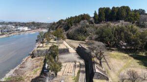 ここは相良(さがら)氏が代々治めた平山城である。相良氏はもともと静岡県の牧之原市相良町付近にいた御家人で、源頼朝による平家討伐の後、この人吉の地頭に任ぜられた。初代当主は相良長頼。相良氏は戦国期に八代や佐敷などにも進出し肥後南部を制圧するも、九州制覇を狙う薩摩の島津氏が北上してきたため服属した。その後、秀吉の九州征伐の際に降伏し、旧領の人吉のみの領地に戻された。